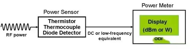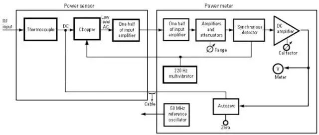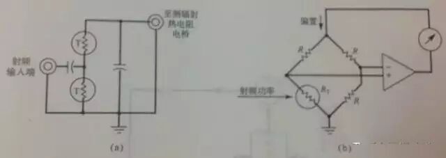 功率计利用称为自动平衡电桥的电路,该电路提供将热敏电阻阻值RT维持恒定在R值上的直流偏置功率。若热敏电阻上的射频功率增加,则电桥使偏置功率减小一个相类似的量。射频功率降低则引起电桥增加偏置功率,使热敏电阻维持恒定的电阻。功率计内的辅助电路对直流功率的这个变化进行处理,以获得功率读数。