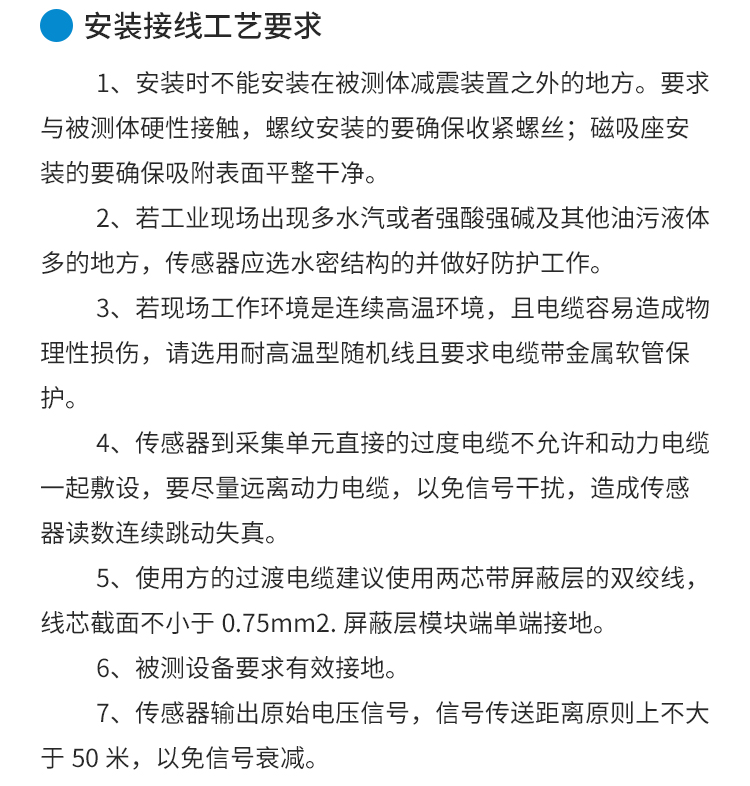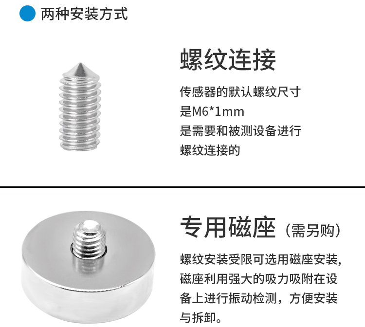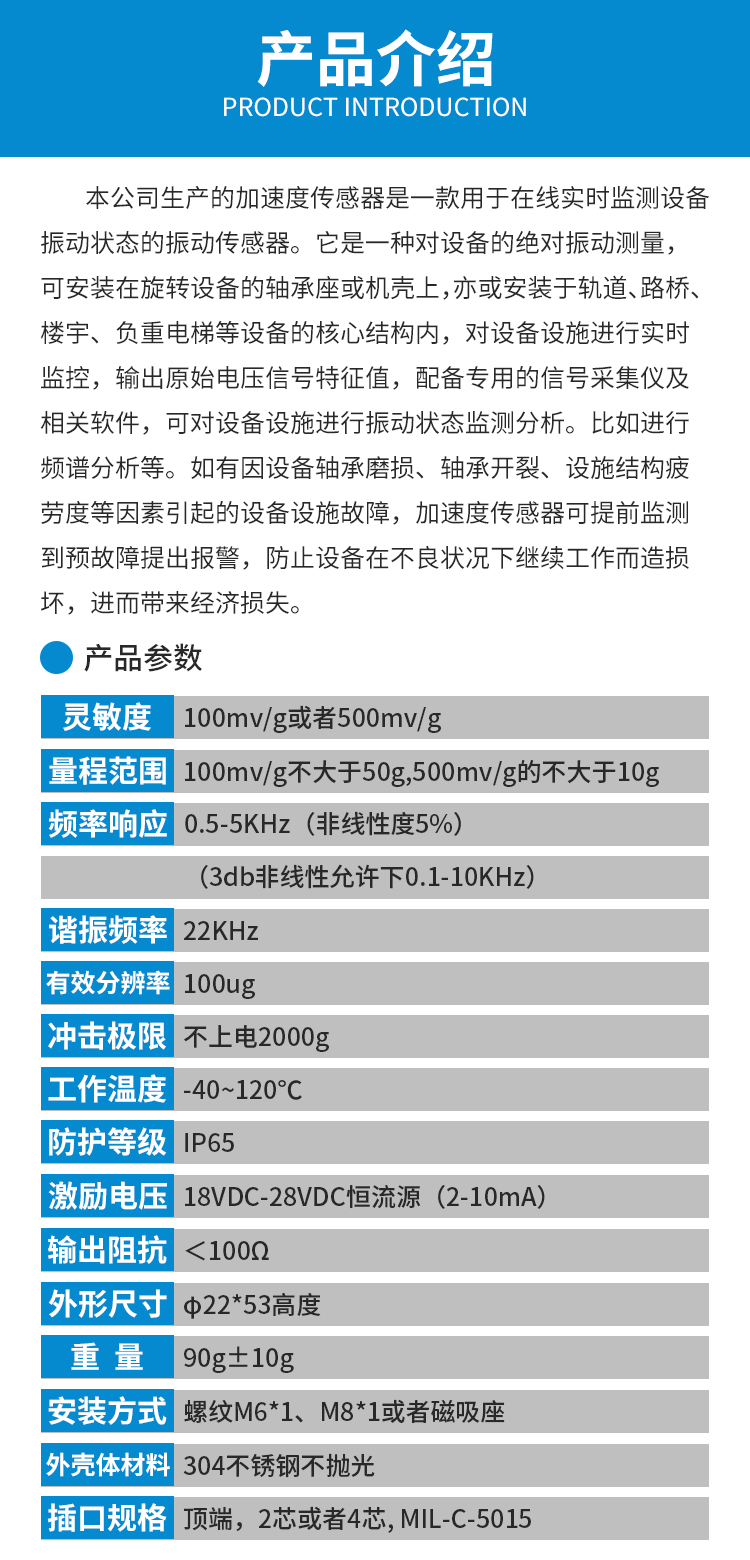 • 产品描述:本公司生产的加速度传感器是一款用于在线实时监测设备振动状态的振动传感器。它是一种对设备的绝对振动测量,可安装在旋转设备的轴承座或机壳上,亦或安装于轨道、路桥、楼宇、负重电梯等设备的核心结构内,对设备设施进行实时监控,输出原始电压信号特征值,配备专用的信号采集仪及相关软件,可对设备设施进行振动状态监测分析。比如进行频谱分析等。如有因设备轴承磨损、轴承开裂、设施结构疲劳度等因素引起的设备设施故障,加速