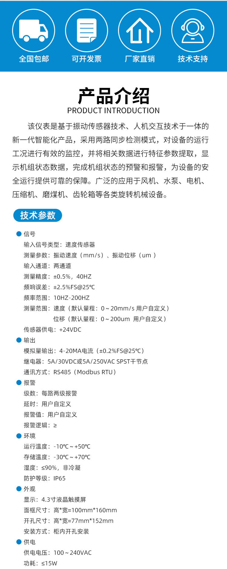 • 产品描述:该仪表是基于振动传感器技术、人机交互技术于一体的新一代智能化产品,采用两路同步检测模式,对设备的运行工况进行有效的监控,并将相关数据进行特征参数提取,显示机组状态数据,完成机组状态的预警和报警,为设备的安全运行提供可靠的保障。广泛的应用于风机、水泵、电机、压缩机、磨煤机、齿轮箱等各类旋转机械设备。